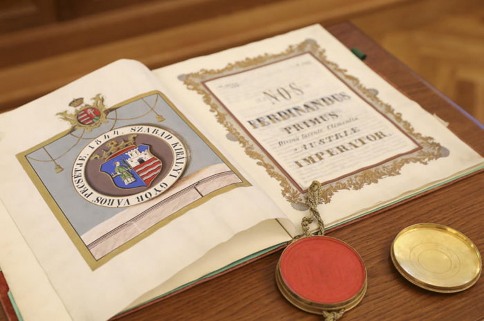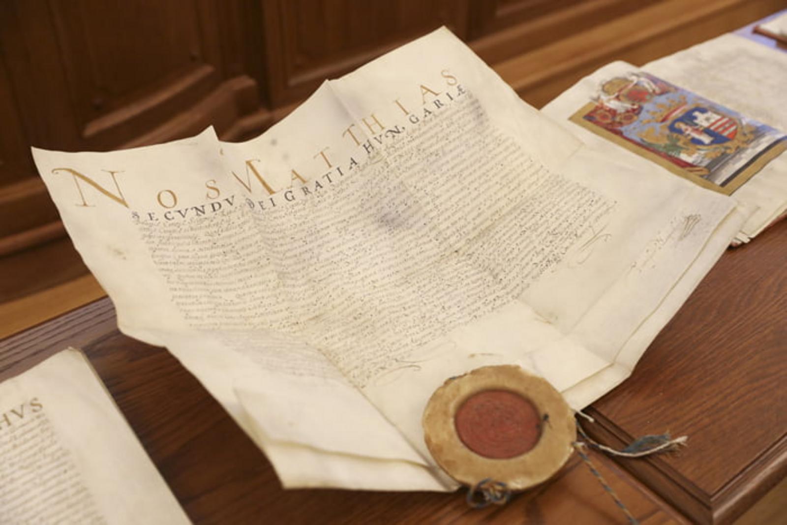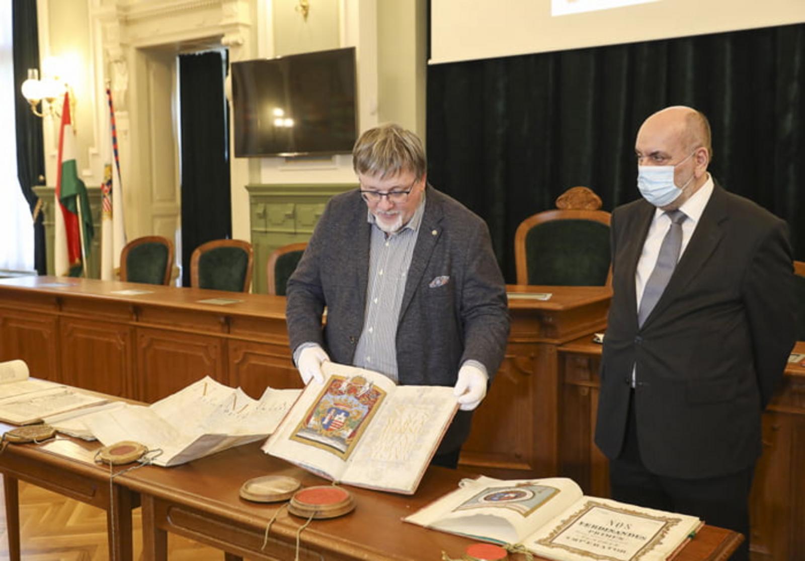 A díszteremben látható volt II. Rudolf 1604-ik évi kiváltságlevele (a korábbi szabadalmak megerősítése), II. Mátyás 1609-ik évi kiváltságlevele (régi szabadalmak és jogszokások megerősítése), valamint V. Ferdinánd 1844-ik évi kiváltságlevele (magyar nyelvű hivatali pecsét engedélyezése). Dr. Bagi Zoltán, főlevéltáros ezen dokumentumokon kívül két céhes szabályzatot is bemutatott, amelyekből levéltárunk több mint húszat őriz, és amelyek folyamatos kiadására is készülnek. A céhes szabályzatok jellemzően latin, német, vagy magyar nyelven íródtak, ezért fakszimilie kiadásuk mellett a fordításuk is megjelenhet majd.