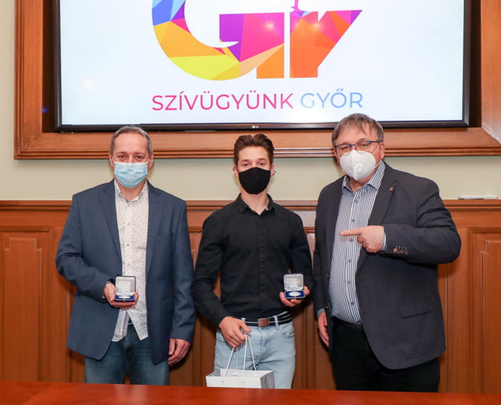 Dr. Dézsi Csaba András a város ezüst emlékérmét adta át a fiatal tornásznak és edzőjének, Szűcs Róbertnek. Mint mondta, fantasztikus eredmény, az, amit Krisztofer elért, nagy örömet okozott vele Győrnek. A polgármester a decemberi Európa-bajnoksághoz is sok sikert kívánt a győri kiválóságnak.