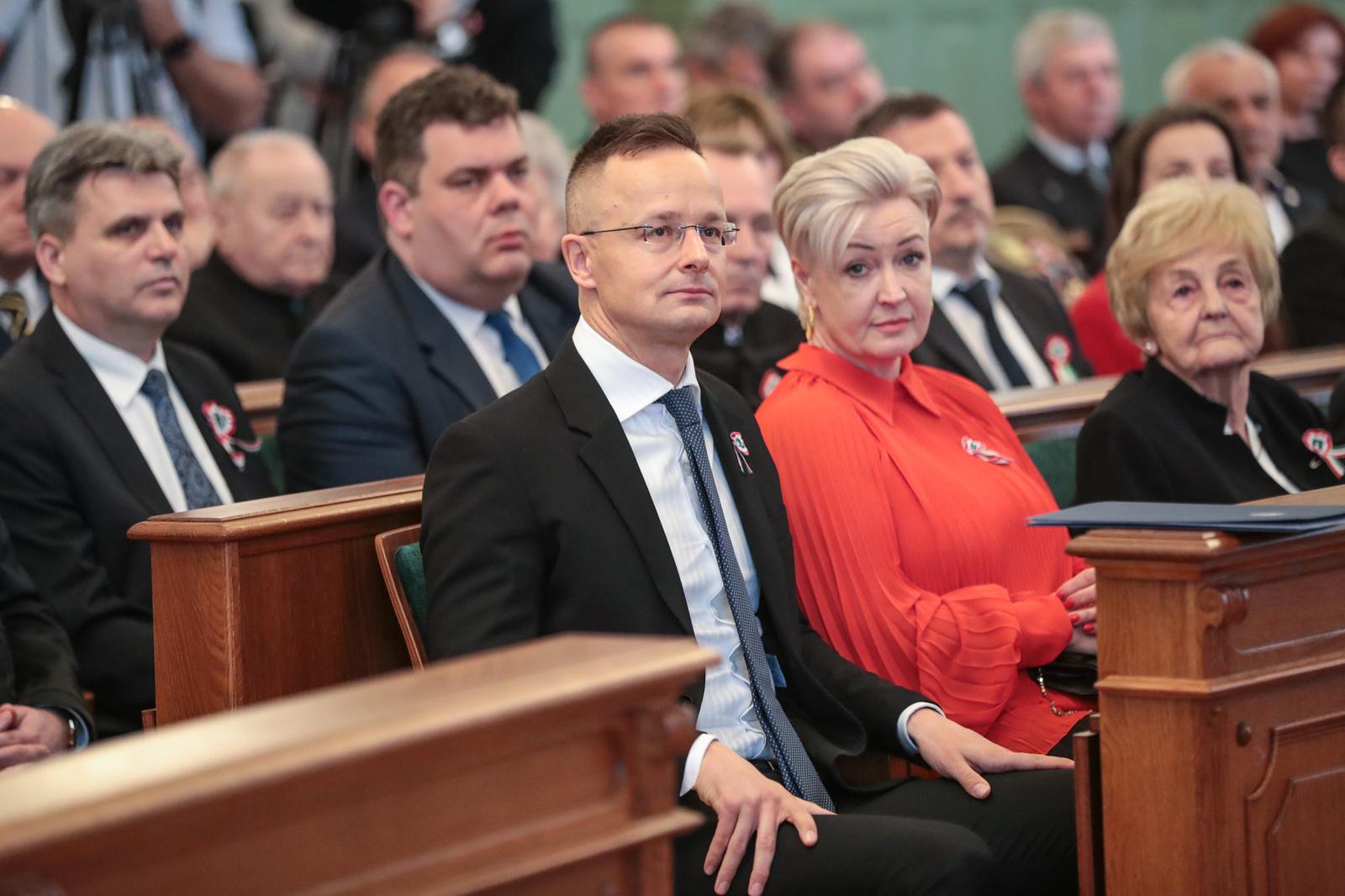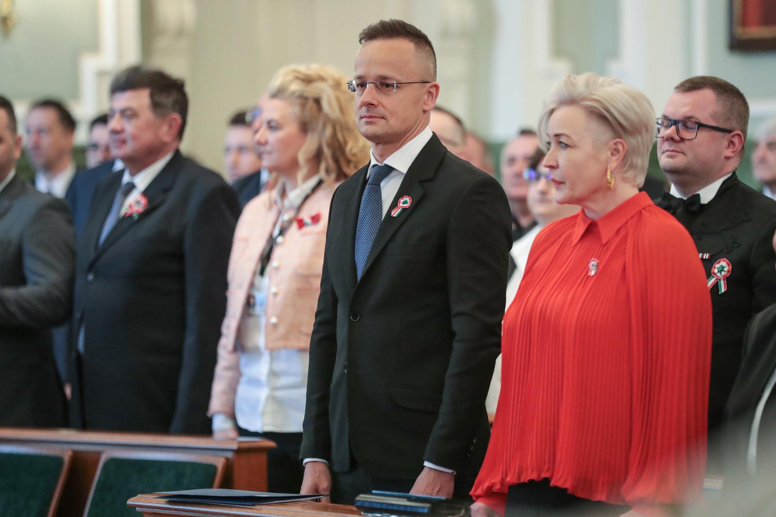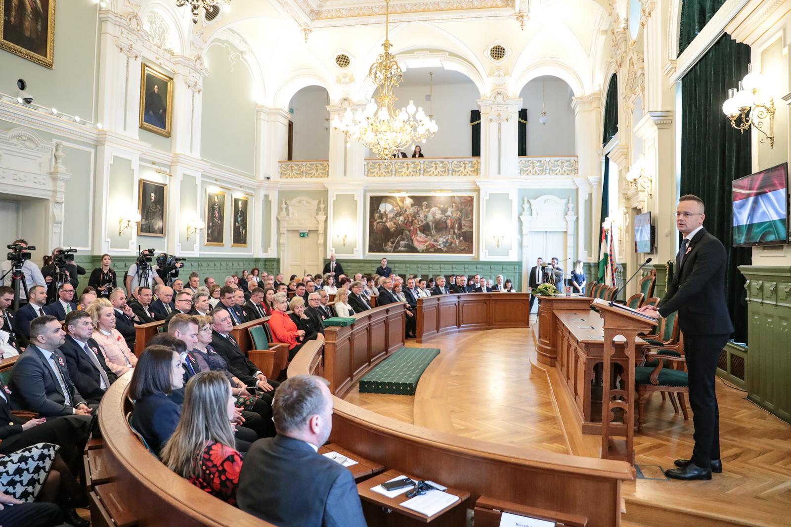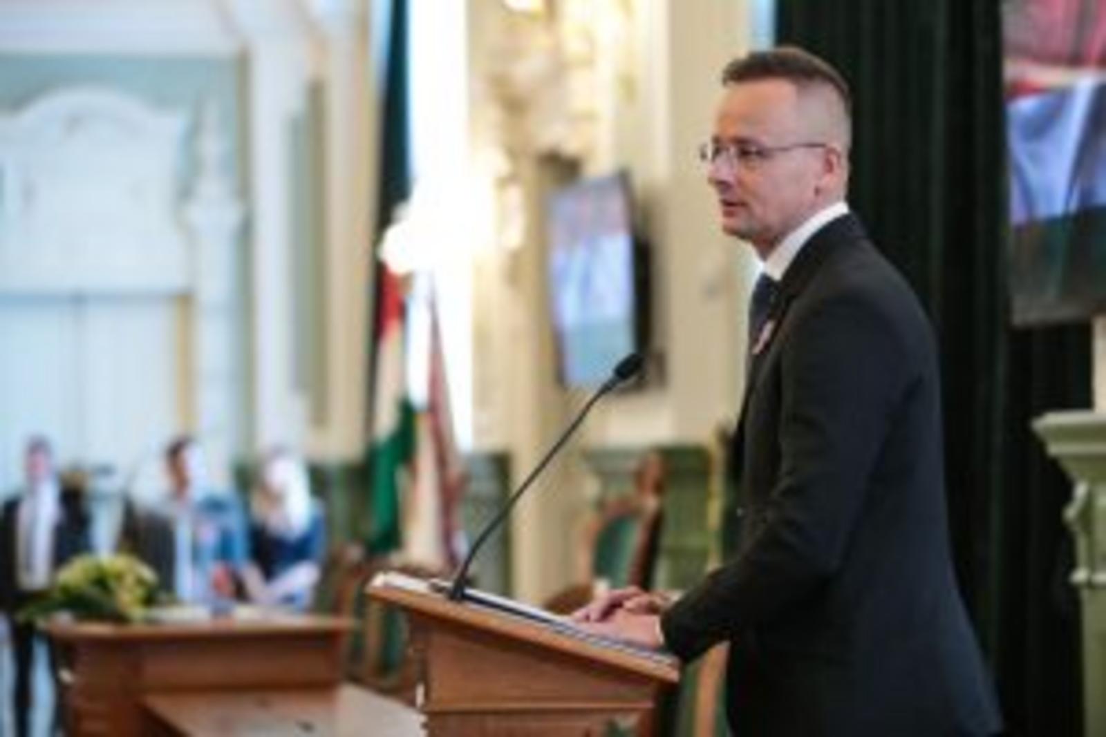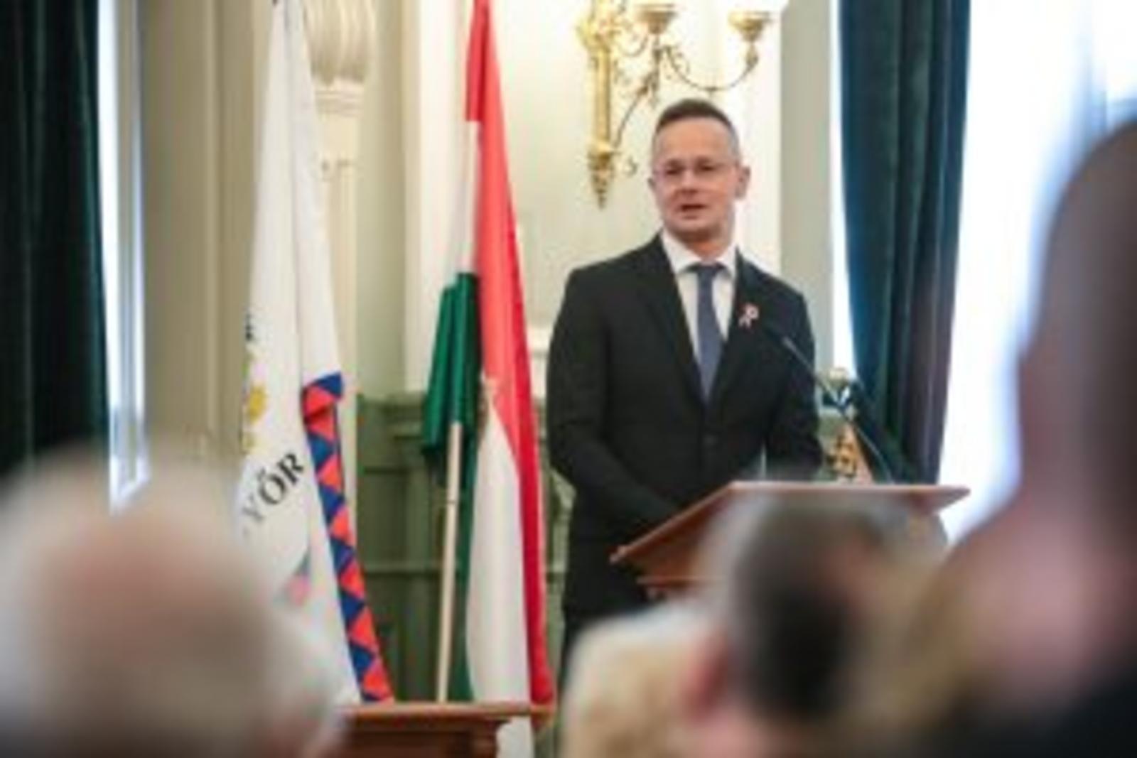 „Szeretném megköszönni ezt a hatalmas megtiszteltetést, hogy ma itt állhatok önök előtt mint a győri díszpolgári cím büszke birtokosa. A díszpolgári cím viselése nemcsak régen, hanem most is egy hatalmas megtiszteltetés. És érdemeimen felül is van, ezt el kell mondjam, úgyhogy ezt legalább annyira tekintem elvárásnak a jövőre nézve is, mint ahogy a múltra vonatkozó méltatásom is elhangzott” – kezdte beszédét Magyarország külgazdasági és külügyminisztere, országgyűlési képviselő.