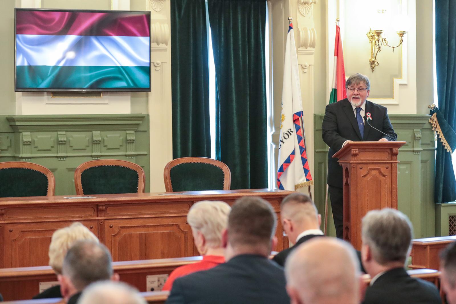 A győri önkormányzat díszközgyűlésen emlékezett az 1848–1849-es forradalom és szabadságharc eseményeire és hőseire március 15-én a városházán. Itt adták át a díszpolgári, a Pro Urbe és a sajtódíjat, valamint felavatták Kolozsváry Ernő egykori polgármester szobrát. „Mi, győriek büszkék vagyunk erre a városra, mi pontosan ismerjük, hogy milyen szorgalmas emberek élnek itt, mi már a jövő sikereit tervezzük, hiszen számunkra szívügyünk Győr” – mondta beszédében a város legújabb díszpolgára, Szijjártó Péter miniszter a szerdai városházi ünnepségen.