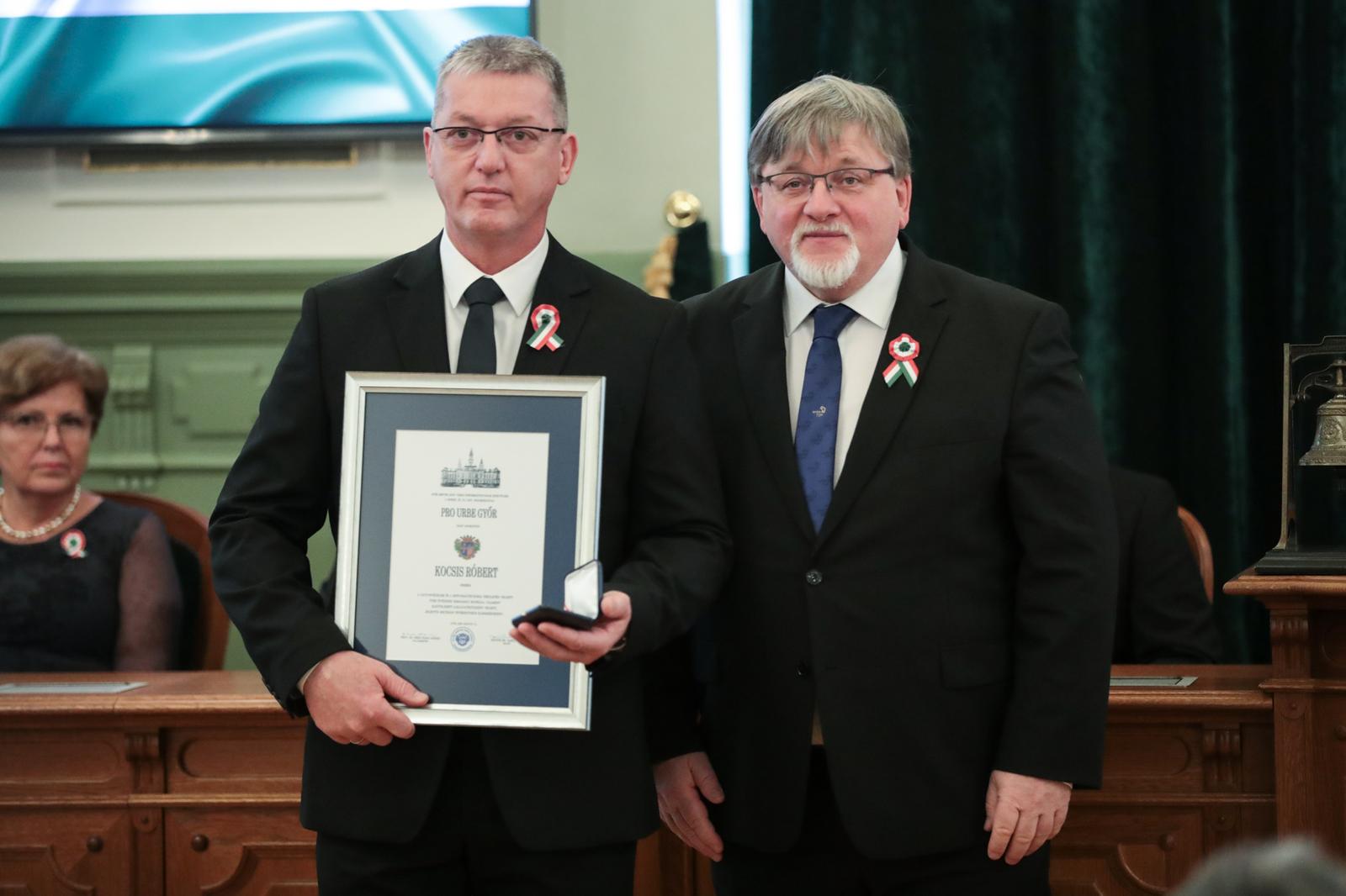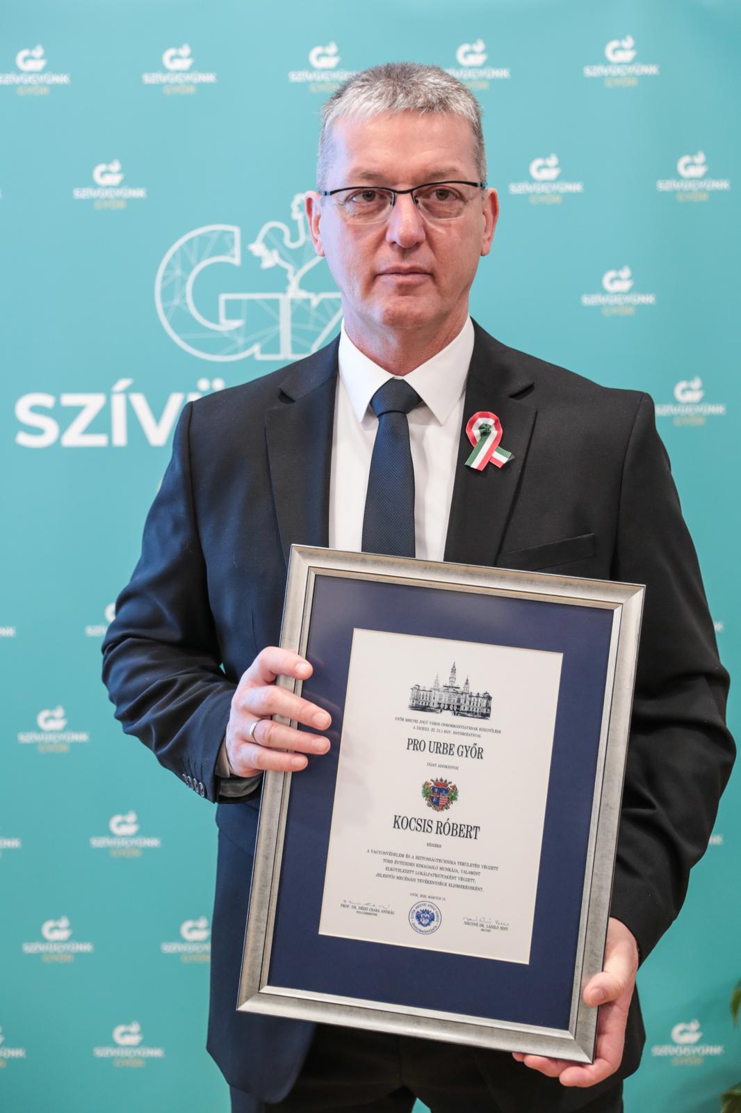 Kocsis Róbert a vagyonvédelem és a biztonságtechnika területén végzett több évtizedes kimagasló munkája, valamint elkötelezett lokálpatriótaként végzett, jelentős mecénási tevékenysége elismeréseként kapott Pro Urbe Győr díjat.