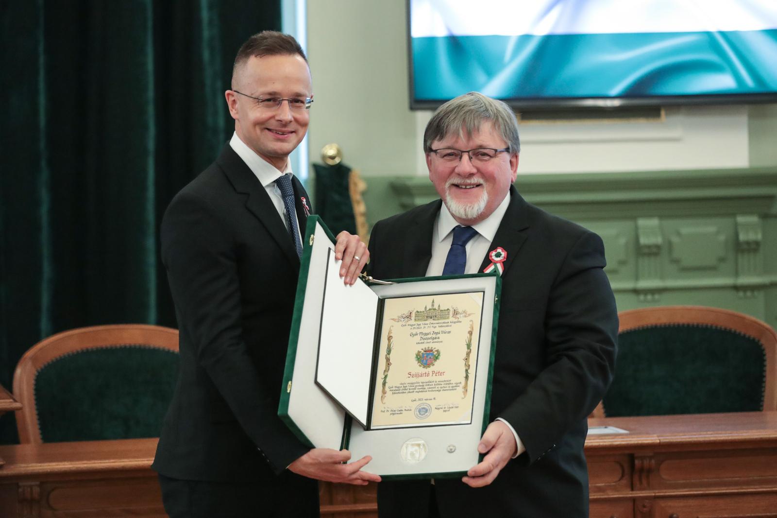 A díszpolgári címet idén Szijjártó Péternek szavazta meg a győri közgyűlés. A politikus országgyűlési képviselőként és miniszterként Győr gazdasági életének fejlődése érdekében végzett, maradandó értéket teremtő munkája, valamint az egyházi és egyetemi fejlesztésekben játszott meghatározó tevékenysége elismeréseként vehette át a díszpolgári címet.