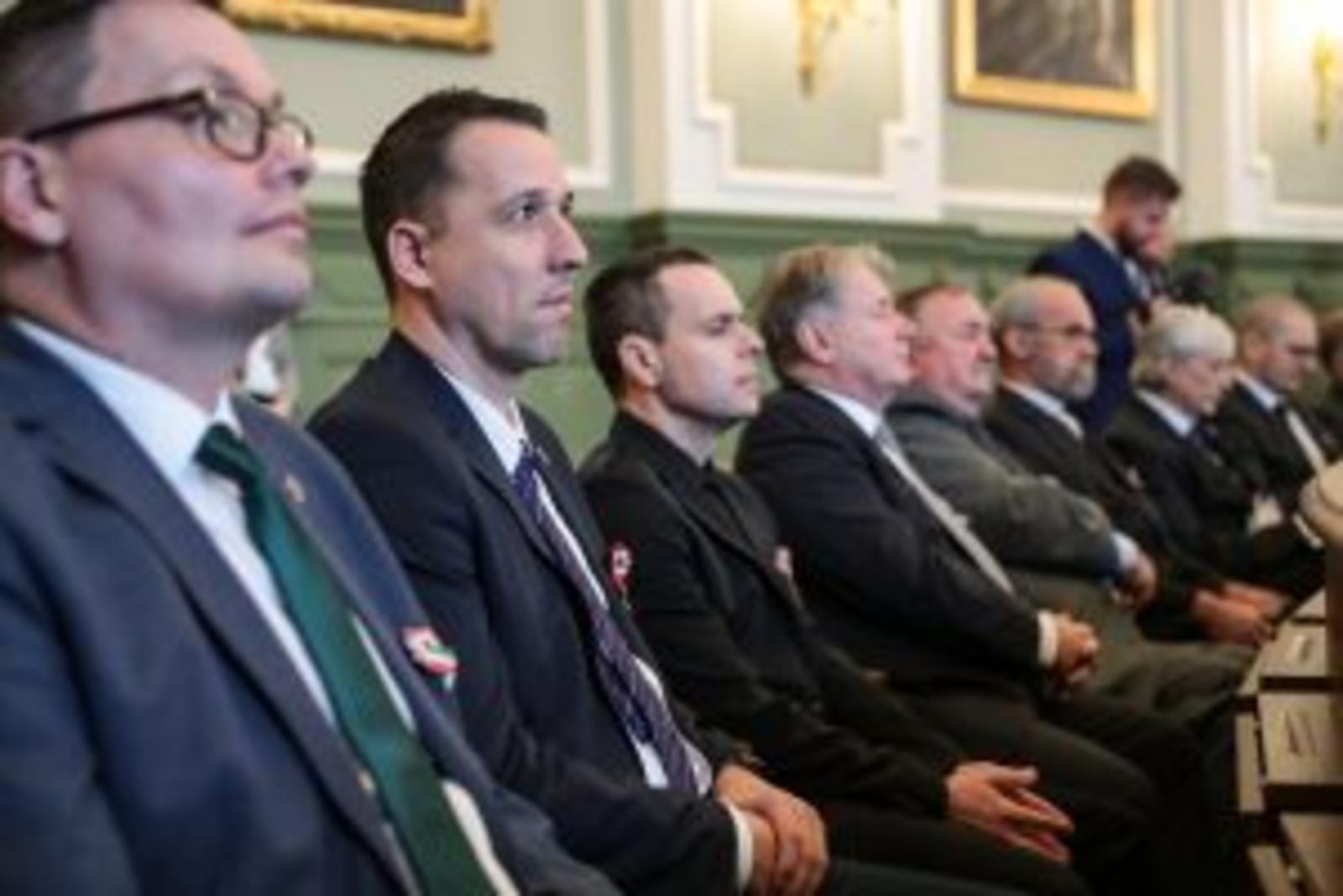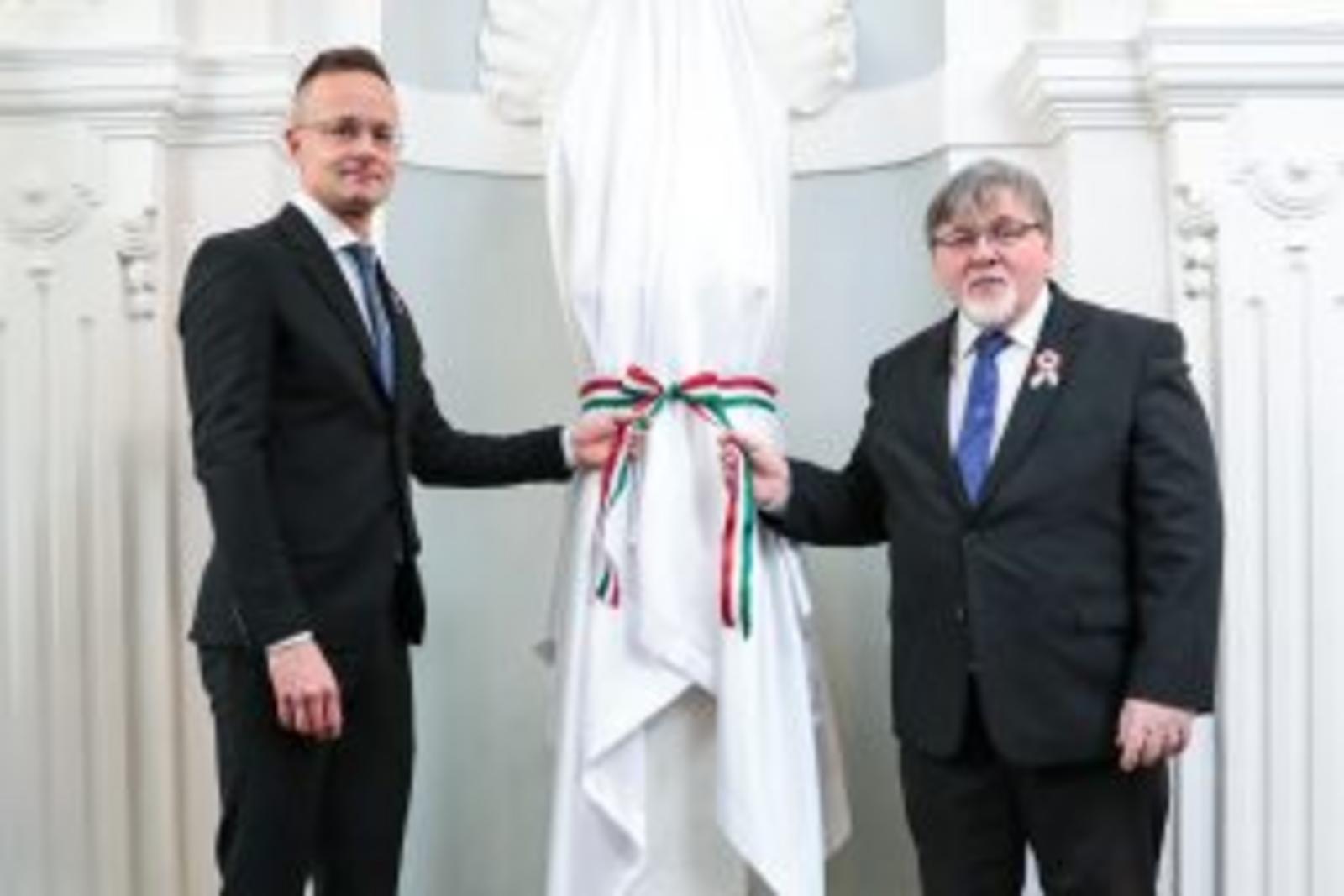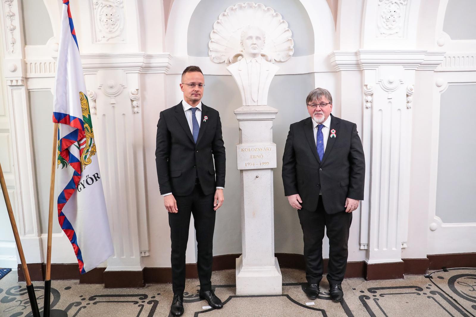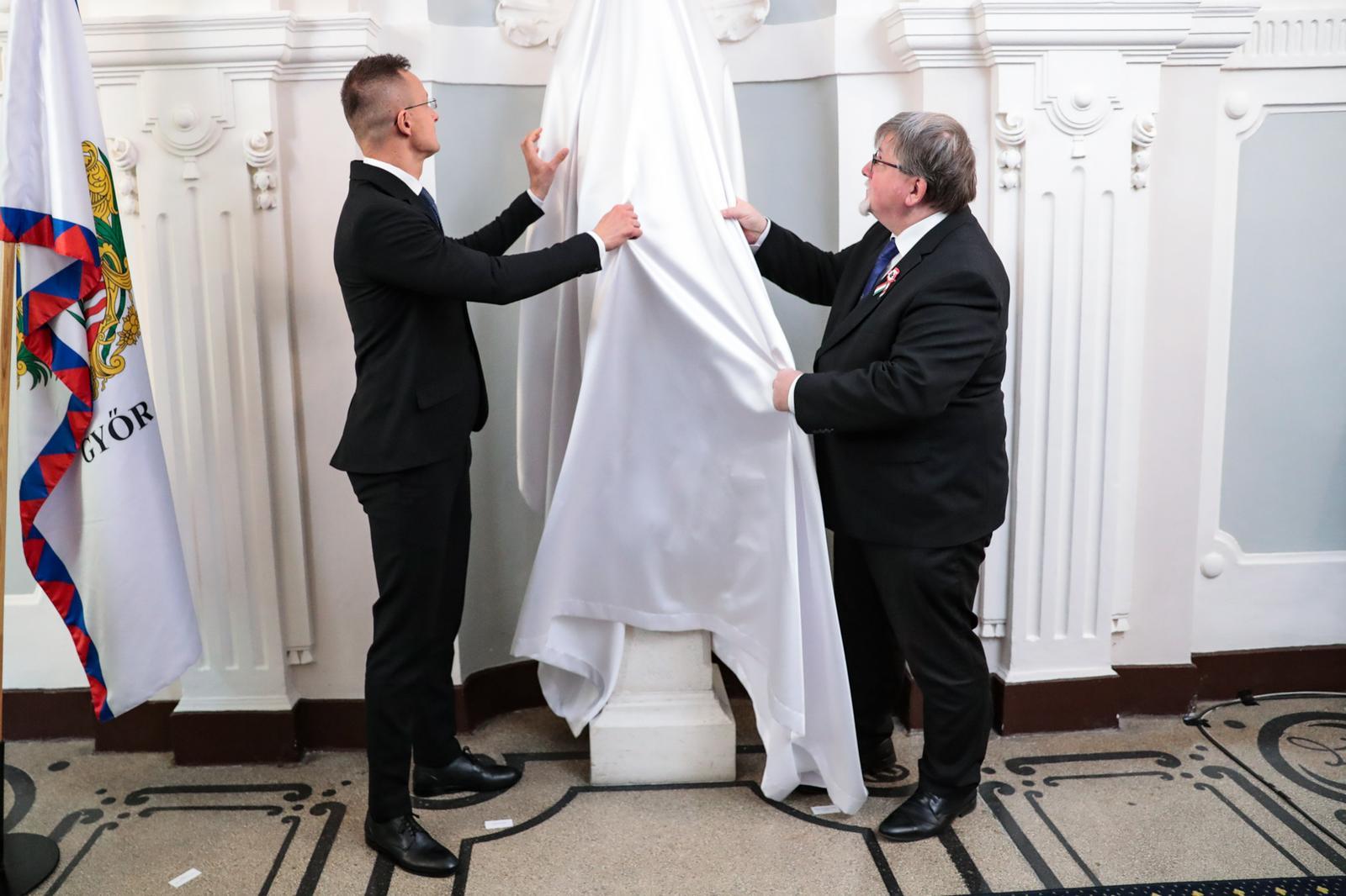 A beszédet követően a díszterem előtti folyosón Szijjártó Péter, valamint dr. Dézsi Csaba polgármester leleplezte Kolozsváry Ernő mellszobrát.