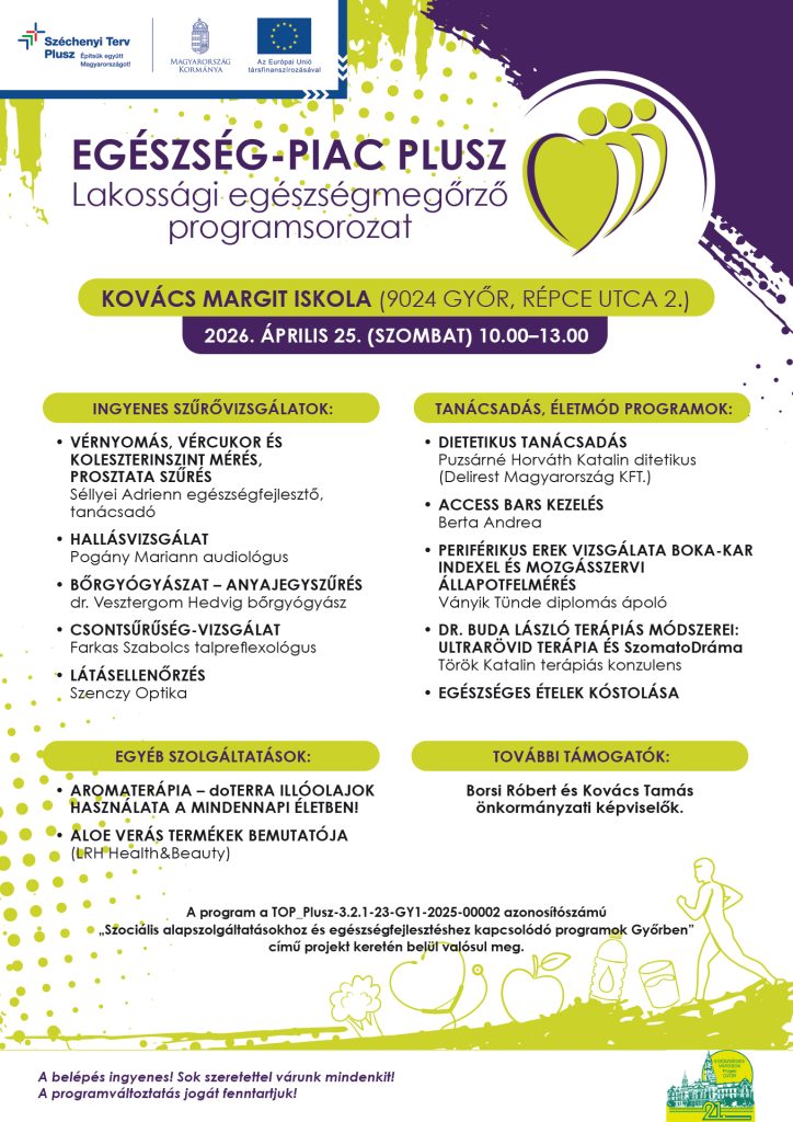 2026. április 25-én, szombaton 10 és 13 óra között Marcalvárosba érkezik az Egészség-Piac Plusz lakossági egészségmegőrző programsorozat. A Kovács Margit Iskolában megrendezésre kerülő eseményen ingyenes szűrővizsgálatokkal, szakértői tanácsadással és életmódprogramokkal várják az érdeklődőket.