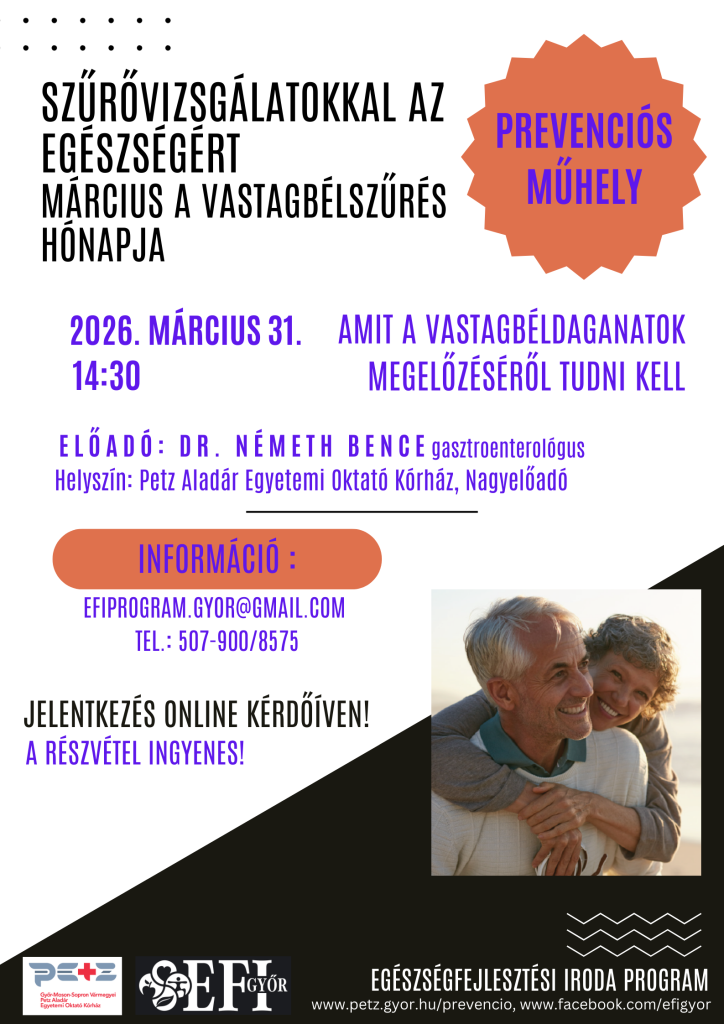 A Győri Járási Egészségfejlesztési Iroda (EFI) minden érdeklődőt szeretettel vár Dr. Németh Bence gasztroenterológus előadására, ahol közérthetően és részletesen esik szó a vastagbélszűrésről és a megelőzés lehetőségeiről.