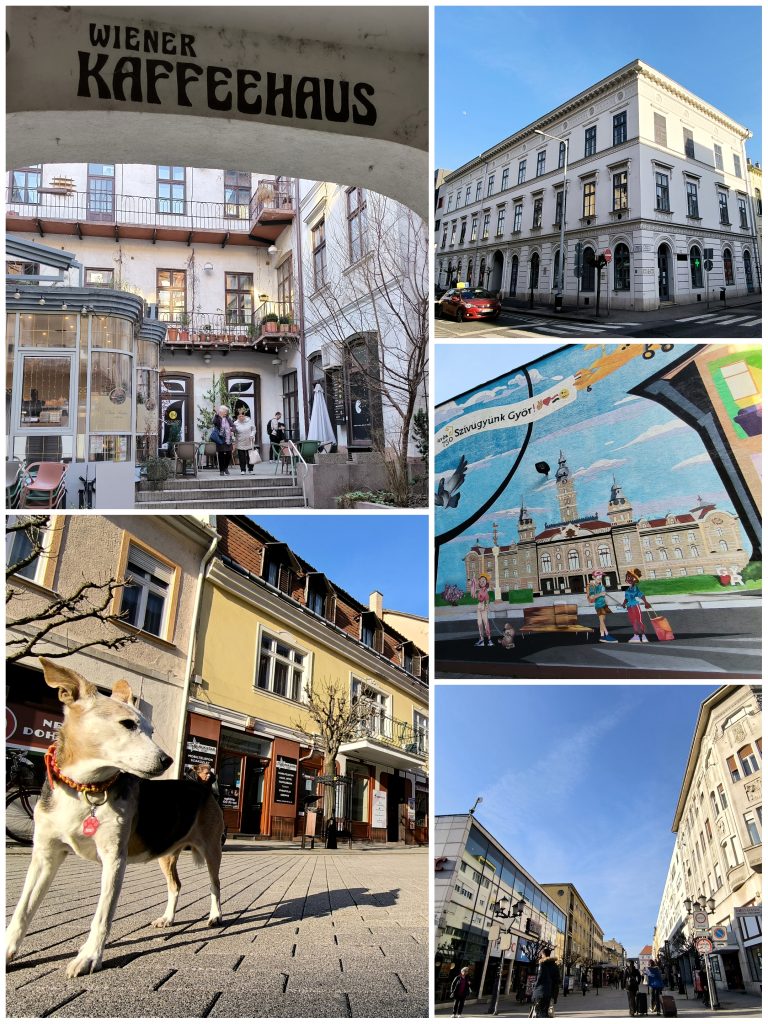 Az Aradi vértanúk útjára fordulva feltűnt a Városháza távoli épülete, mi azonban egyelőre a sétálóutca irányát céloztuk meg. Közben az Arrabona udvar parkolójának bejáratánál a város nevezetességeivel találtuk magunkat szemben, méghozzá igényes falfestmény formájában.