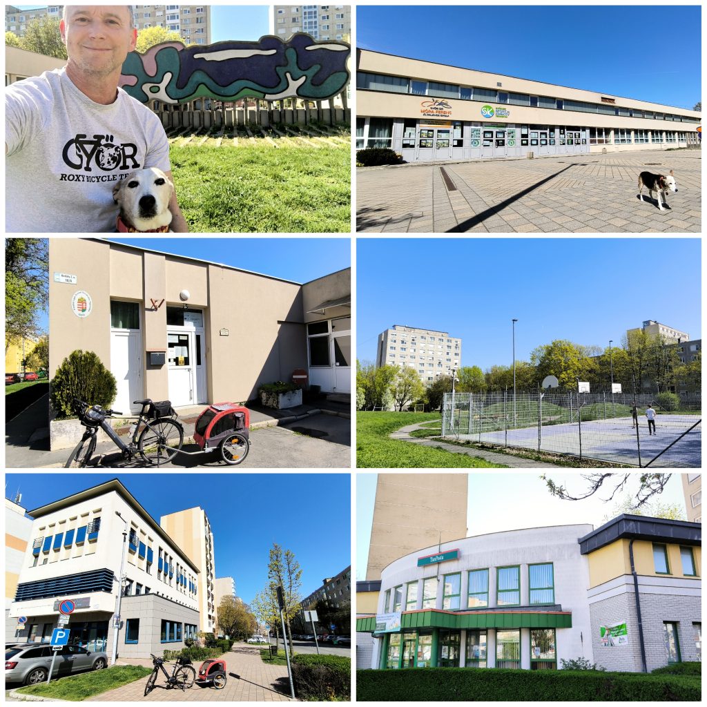 Visszatérve a Földes Gábor utcába, a számunkra már belülről sem ismeretlen Győr Plusz Rádió otthona előtt időztünk kicsit, majd a körforgalmon átkelve máris a Kodály Zoltán utcát nyugatról határoló „felhőkarcolókat”, előttük pedig a Posta épületét pillantottuk meg.