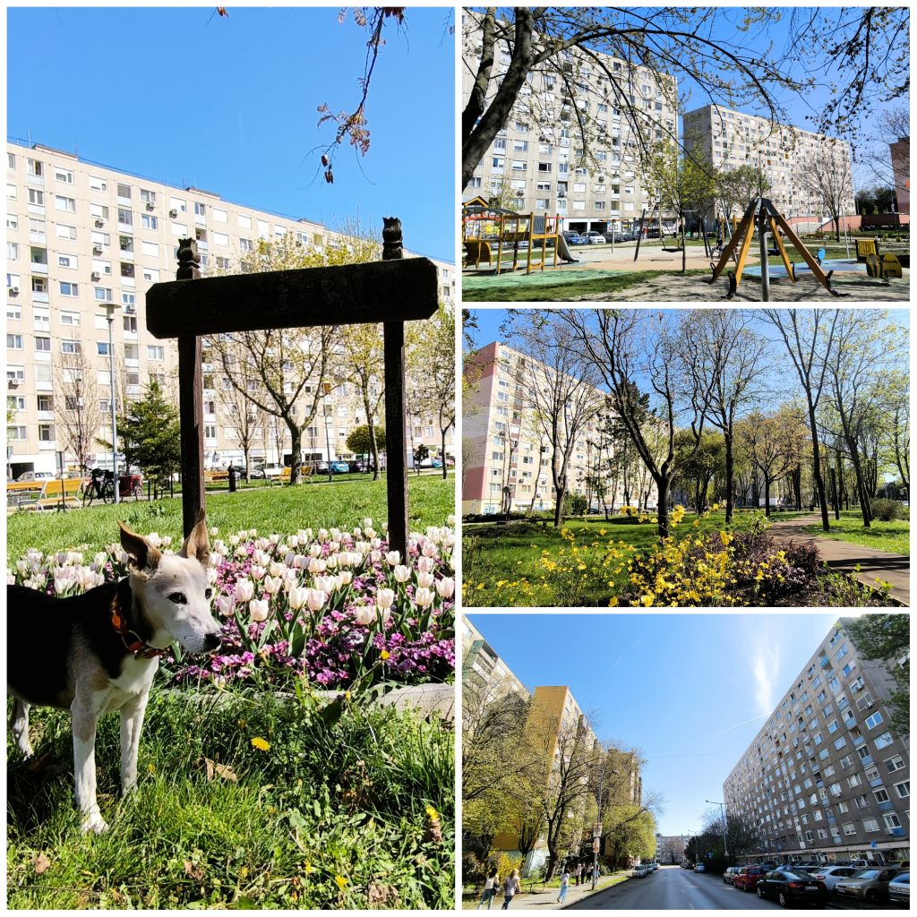 A lakótömbök ezen a szakaszon felváltva, merőlegesen és párhuzamosan helyezkednek el, közöttük pedig apró ligetek bújnak meg. Na és az egyik sarkon az a kiskocsma, ami közel egyidős a lakóházakkal, és pályafutása során működött már falatozóként és zöldségesként is.