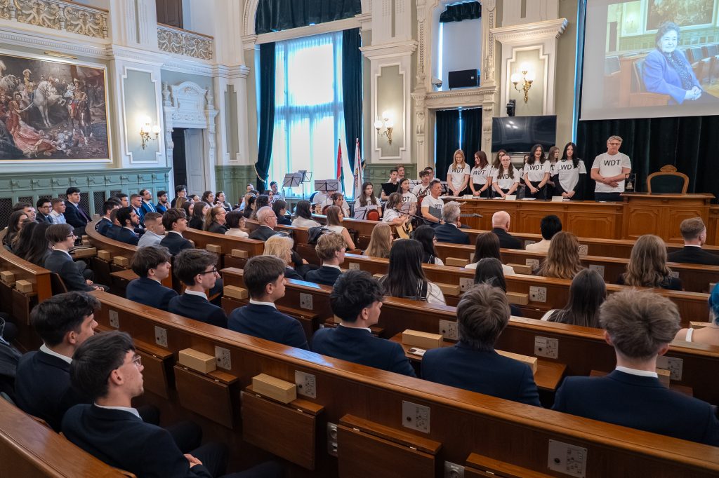 A hagyományokhoz híven idén is a Városháza Dísztermében gyűltek össze Győr középiskolás kollégiumainak végzős növendékei. Az ünnepség a fiatalok bátorságát és önállóságát állította középpontba, hiszen – ahogy a ballagási meghívón szereplő II. Rákóczi Ferenc-idézet is emlékeztetett – az értékek és emlékek megőrzése közös kincsünk.
