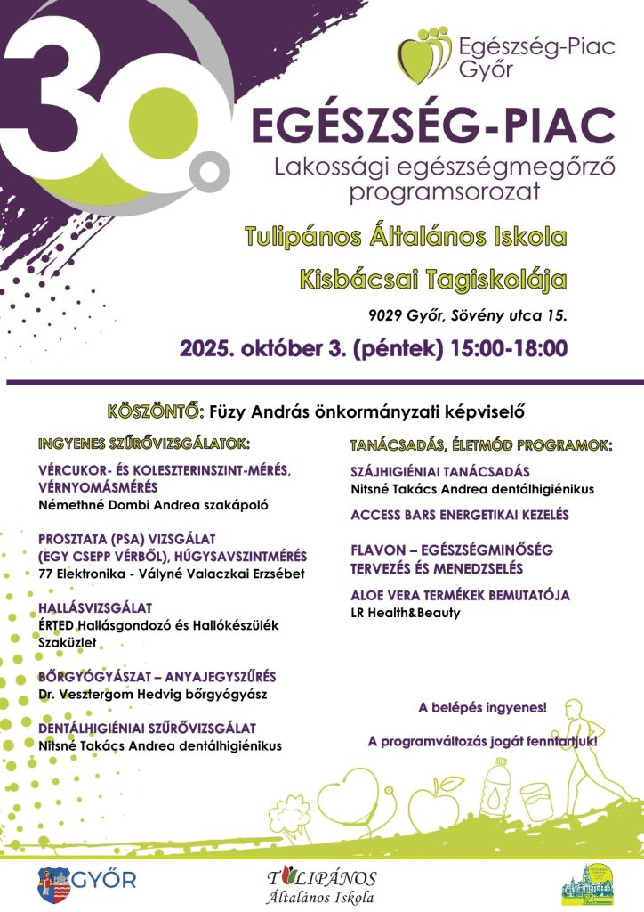 Október 3. péntek 15.00-18.: Tulipános Általános Iskola Kisbácsai Tagiskolája – Győr, Sövény utca 15.