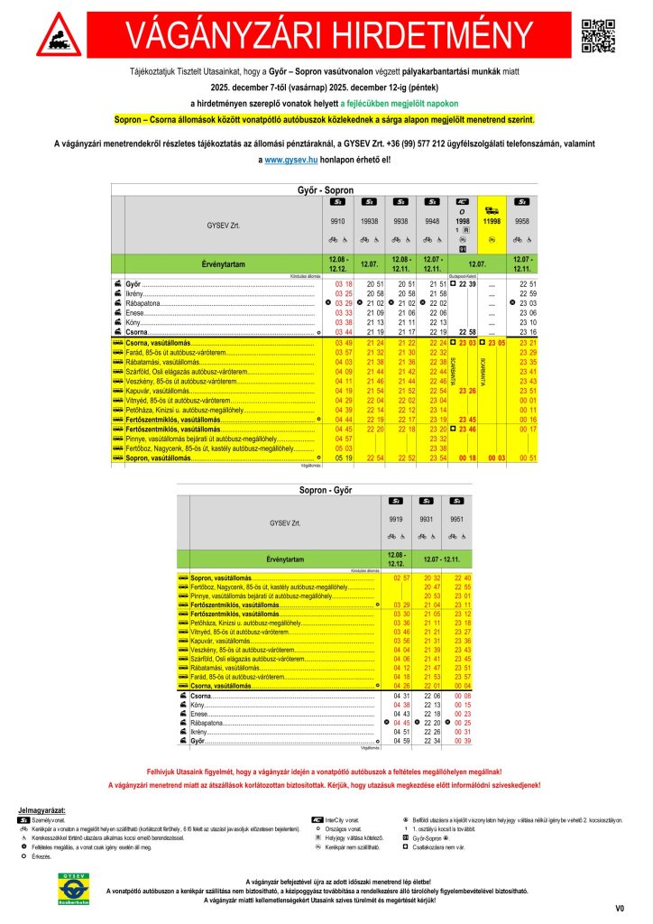 A GYSEV Zrt tájékoztatása alapján a Győr – Sopron vasútvonalon végzett pályakarbantartási munkák miatt 2025. december 7-től (vasárnap) 2025. december 12-ig (péntek) a hirdetményen szereplő vonatok helyett a fejlécükben megjelölt napokon Sopron – Csorna állomások között vonatpótló autóbuszok közlekednek a sárga alapon megjelölt menetrend szerint.